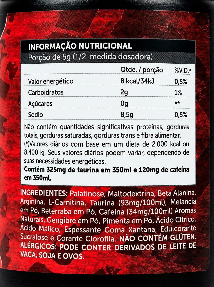 Avisos Importantes: Este produto é um suplemento alimentar para adultos ativos. Contém estimulantes. NÃO EXCEDA A DOSAGEM RECOMENDADA. O consumo deve estar associado a uma alimentação equilibrada. Não é indicado para gestantes, lactantes, crianças, pessoas sensíveis a cafeína, com condições cardiovasculares, hipertensão ou qualquer problema de saúde. Sempre consulte um médico ou nutricionista antes do uso. Mantenha fora do alcance de crianças.