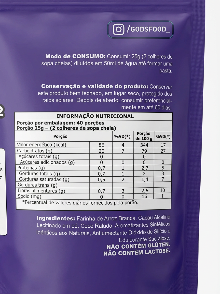 Ingredientes: Farinha de Arroz, Cacau em Pó, Coco Ralado, Aromatizantes, Edulcorantes e Espessantes. (Consulte o rótulo para lista completa e precisa).