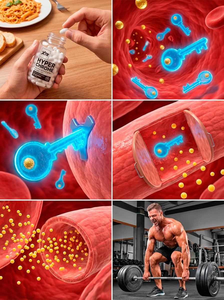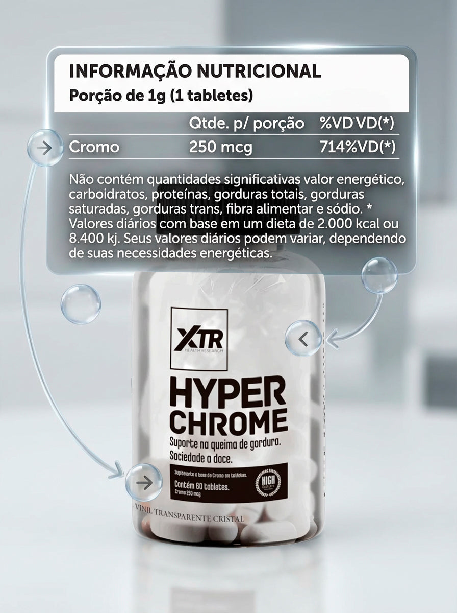 PARE DE LUTAR CONTRA A FOME E OS PICOS DE ENERGIA. O verdadeiro controle sobre sua composição corporal e desempenho não começa com mais restrição. Começa com a OTIMIZAÇÃO METABÓLICA. Apresentamos o HYPER CHROME da XTR: não um "suplemento para emagrecer", mas a ferramenta de precisão para quem exige eficiência máxima no uso do seu principal combustível: a glicose. Para o atleta de Uberlândia e do Brasil que entende que ganhos sólidos são construídos sobre um metabolismo afinado, a escolha é estratégica. Você deixa seu corpo operar no modo ineficiente ou assume o controle do seu motor biológico?