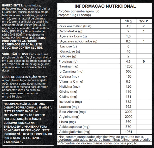| Modo de Usar | Diluir 1/2 dose (cerca de 7,5g) em 300-350ml de água fria. Consumir 20-30 minutos antes do treino. NUNCA EM JEJUM. |